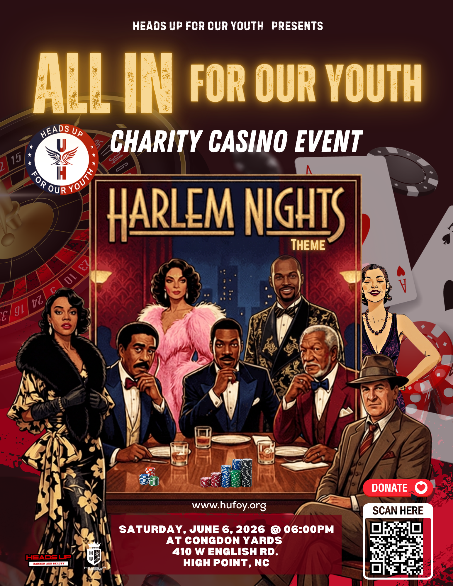 Heads Up For Our Youth is rolling out an unforgettable evening at Congdon Yards with our All In For Our Youth Charity Casino Night, a Harlem Nights–themed celebration designed to unite supporters, partners, and friends for a powerful cause. As we move toward the 11th Annual Back to School Rally, this signature fundraiser invites the community to come together as we bet on the bright future of our youth.